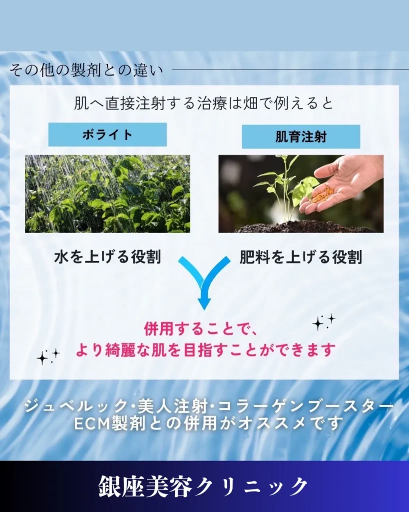 どちらも「肌を整える」目的の注入治療ですが、成分・作用の考え方・持続期間に違いがあります。